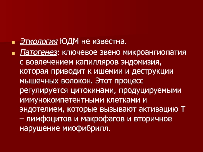 процесс регулируется цитокинами, продуцируемыми иммунокомпетентными клетками и эндотелием, которые вызывают активацию Т – лимфоцитов и макрофагов и вторичное нарушение миофибрилл.