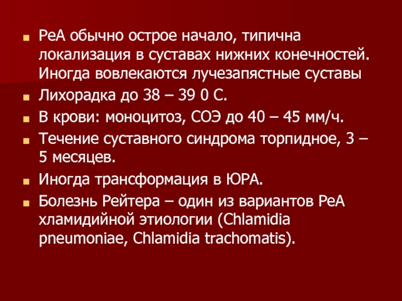 Слайд 11РеА обычно острое начало, типична локализация в суставах нижних конечностей.
