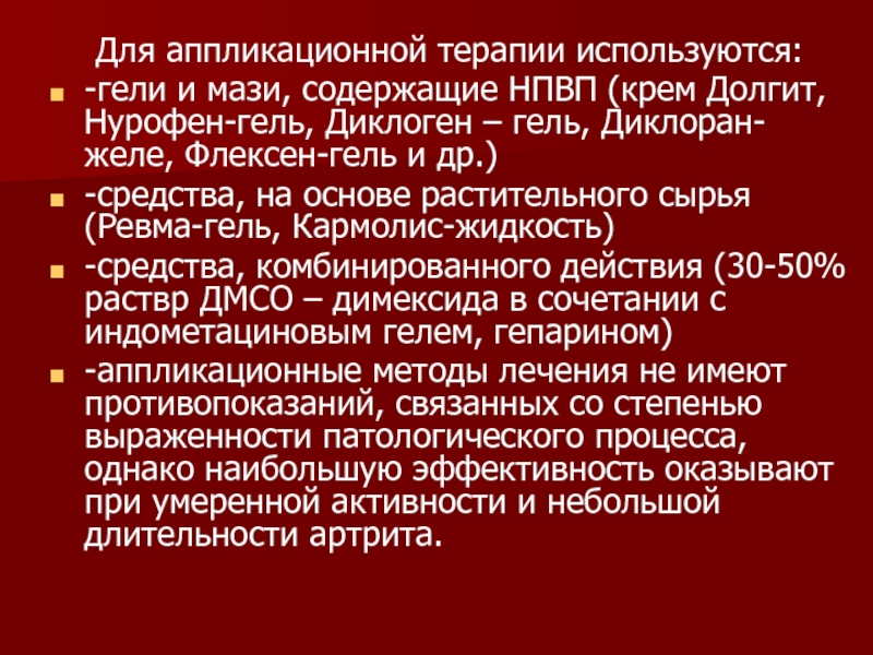 -аппликационные методы лечения не имеют противопоказаний, связанных со степенью выраженности патологического процесса, однако наибольшую эффективность оказывают при умеренной активности и небольшой длительности артрита.