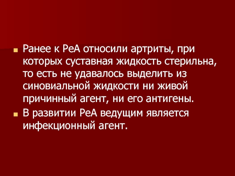 Слайд 3Ранее к РеА относили артриты, при которых суставная жидкость стерильна,
