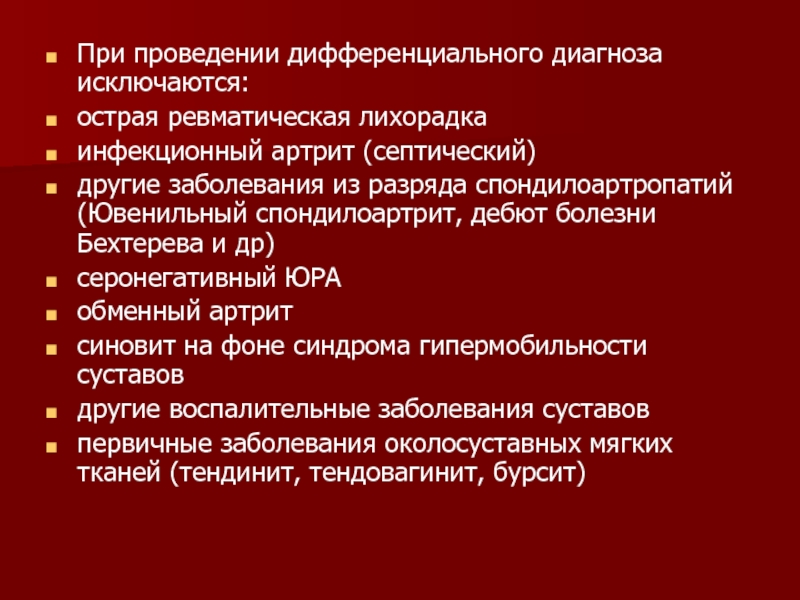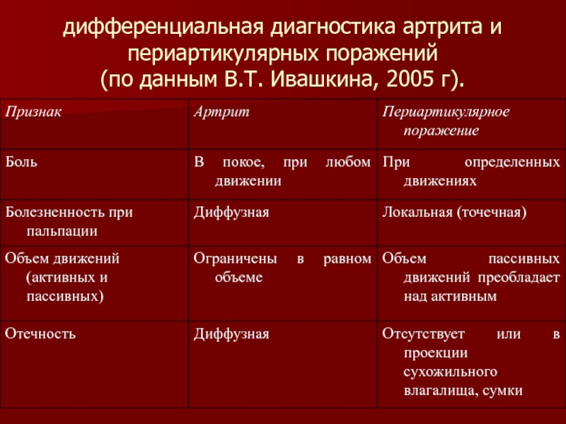 Слайд 23дифференциальная диагностика артрита и периартикулярных поражений