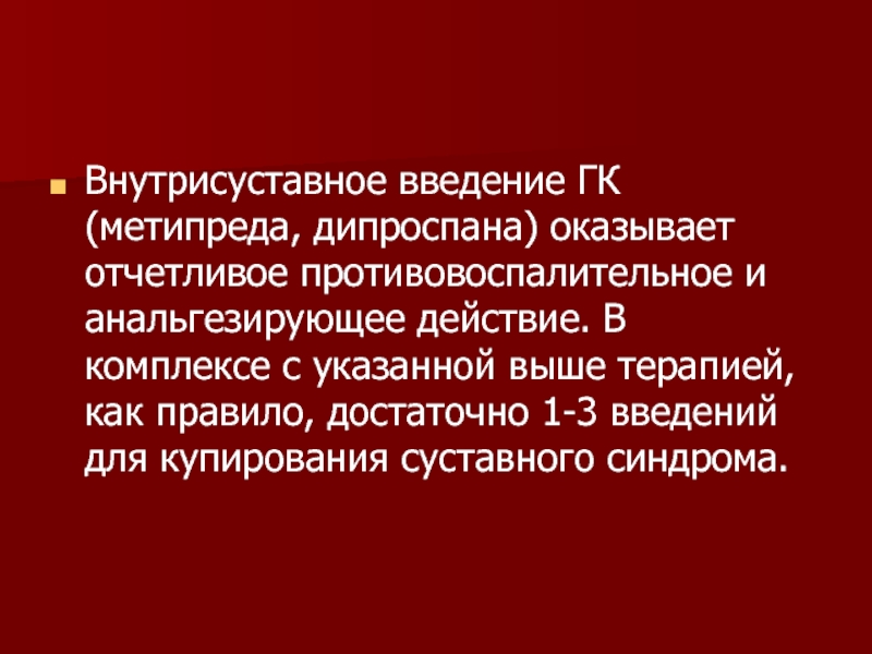 Слайд 36Внутрисуставное введение ГК (метипреда, дипроспана) оказывает отчетливое противовоспалительное и анальгезирующее