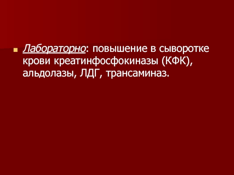 Слайд 43Лабораторно: повышение в сыворотке крови креатинфосфокиназы (КФК), альдолазы, ЛДГ, трансаминаз.
