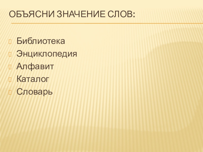 Объясни значение слов: БиблиотекаЭнциклопедияАлфавитКаталогСловарь