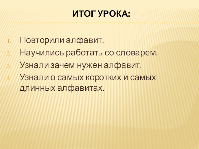 Итог урока:  Повторили алфавит.Научились работать со словарем.Узнали зачем нужен алфавит.Узнали о самых коротких и самых длинных