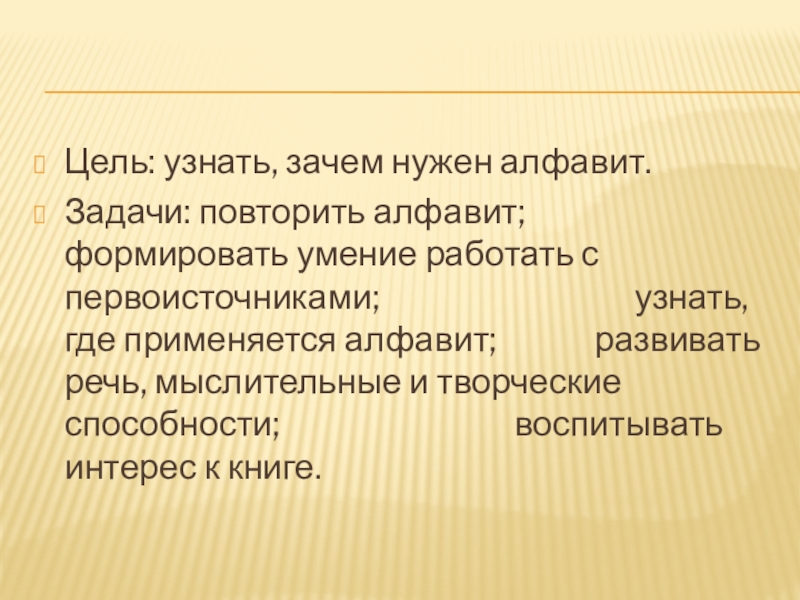 Цель: узнать, зачем нужен алфавит.Задачи: повторить алфавит;						формировать умение работать с первоисточниками;							узнать, где применяется алфавит;			развивать речь, мыслительные и