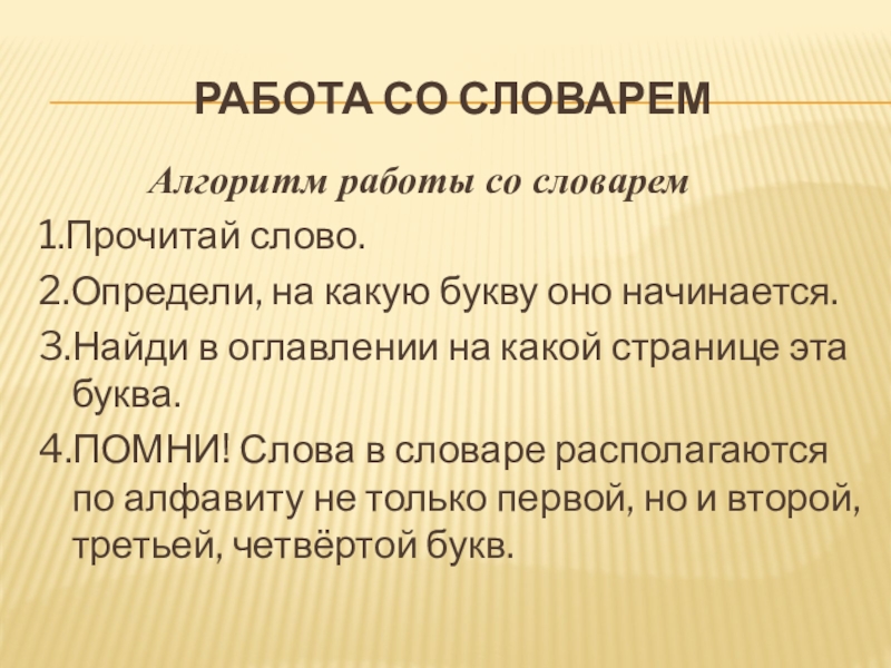 Работа со словарем       Алгоритм работы со словарем1.Прочитай слово. 2.Определи, на какую