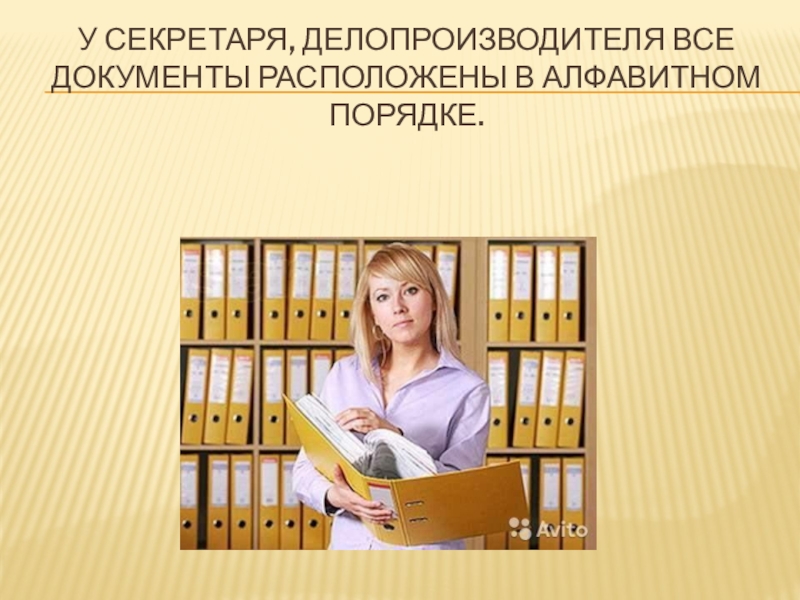 Слайд 14У секретаря, делопроизводителя все документы расположены в алфавитном порядке.