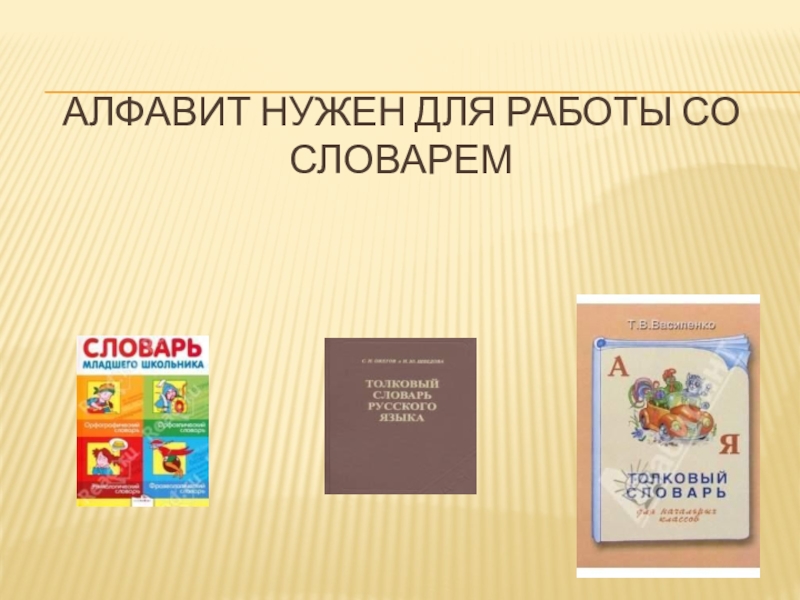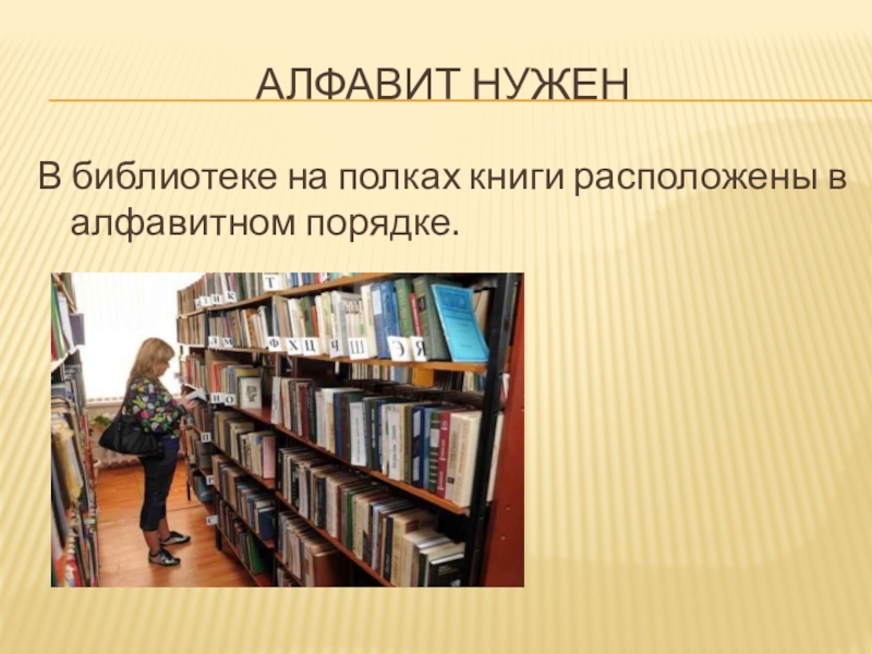 Алфавит нуженВ библиотеке на полках книги расположены в алфавитном порядке.
