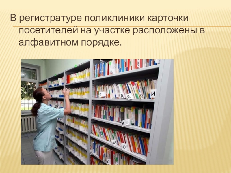 Слайд 13В регистратуре поликлиники карточки посетителей на участке расположены в алфавитном