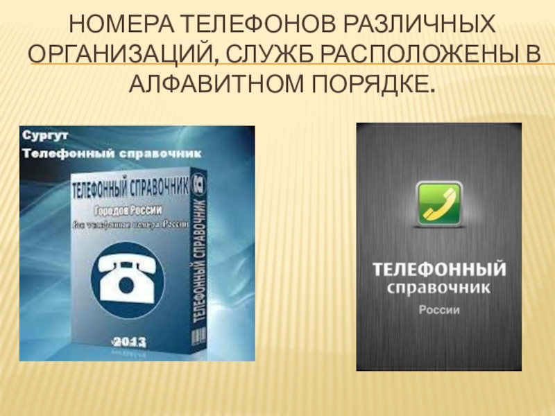 Слайд 17Номера телефонов различных организаций, служб расположены в алфавитном порядке.