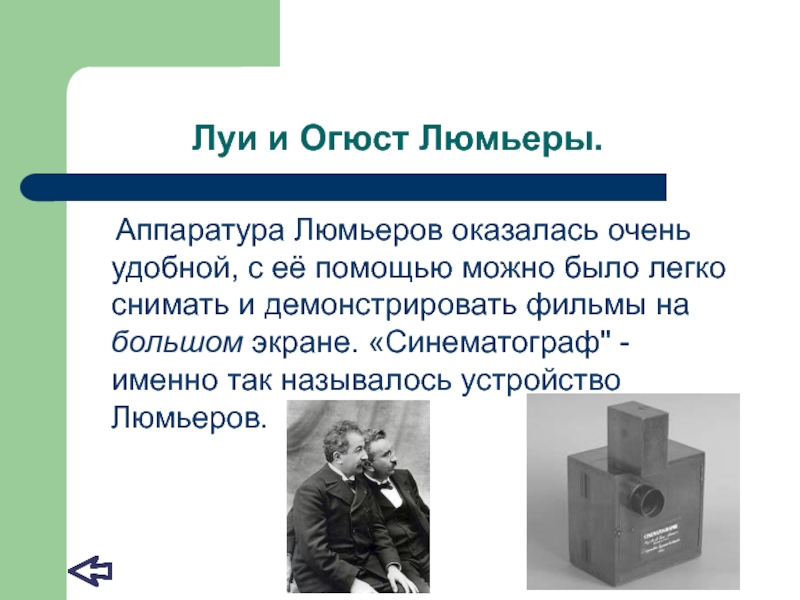 легко снимать и демонстрировать фильмы на большом экране. «Синематограф" - именно так называлось устройство Люмьеров.