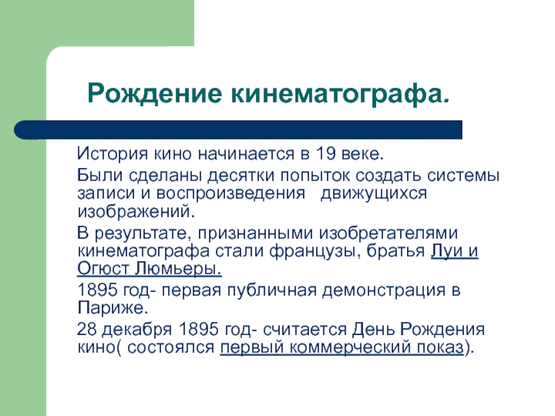 28 декабря 1895 год- считается День Рождения кино( состоялся первый коммерческий показ).