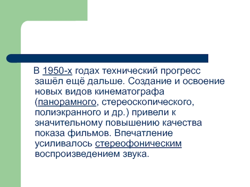 др.) привели к значительному повышению качества показа фильмов. Впечатление усиливалось стереофоническим воспроизведением звука.