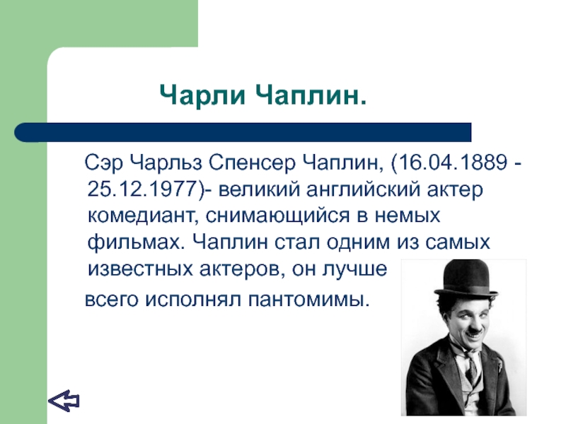 английский актер комедиант, снимающийся в немых фильмах. Чаплин стал одним