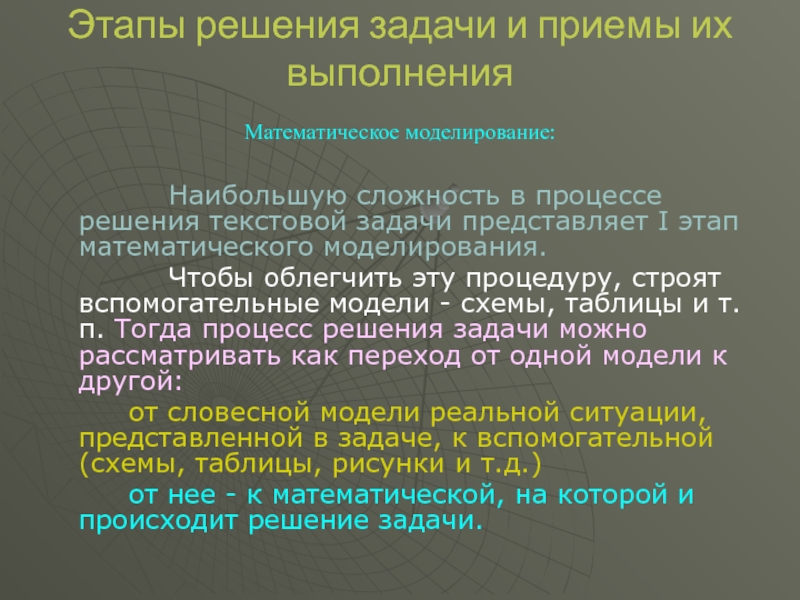 Чтобы облегчить эту процедуру, строят вспомогательные модели - схемы, таблицы и т.п. Тогда процесс решения задачи можно рассматривать как переход от одной модели к другой: