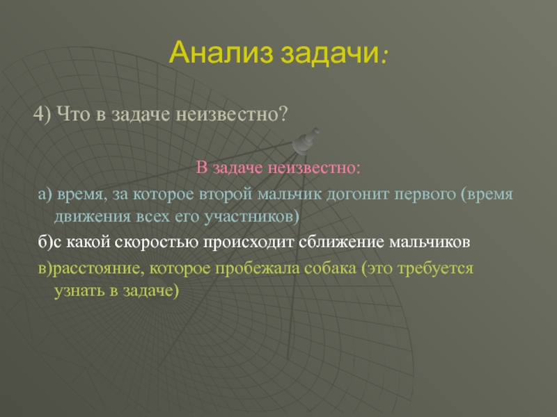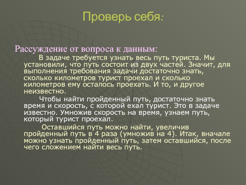 При этом выделяются необходимые для решения данные и искомые и математическими способами описываются связи между ними