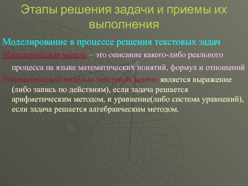 Математической моделью текстовой задачи является выражение(либо запись по действиям), если задача решается арифметическим методом, и уравнение(либо система уравнений), если задача решается алгебраическим методом.