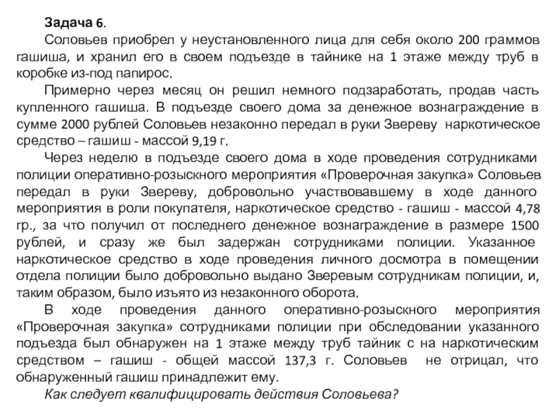 Через неделю в подъезде своего дома в ходе проведения сотрудниками полиции оперативно-розыскного мероприятия «Проверочная закупка» Соловьев передал в руки Звереву, добровольно участвовавшему в ходе данного мероприятия в роли покупателя, наркотическое средство - гашиш - массой 4,78 гр., за что получил от последнего денежное вознаграждение в размере 1500 рублей, и сразу же был задержан сотрудниками полиции. Указанное наркотическое средство в ходе проведения личного досмотра в помещении отдела полиции было добровольно выдано Зверевым сотрудникам полиции, и, таким образом, было изъято из незаконного оборота.