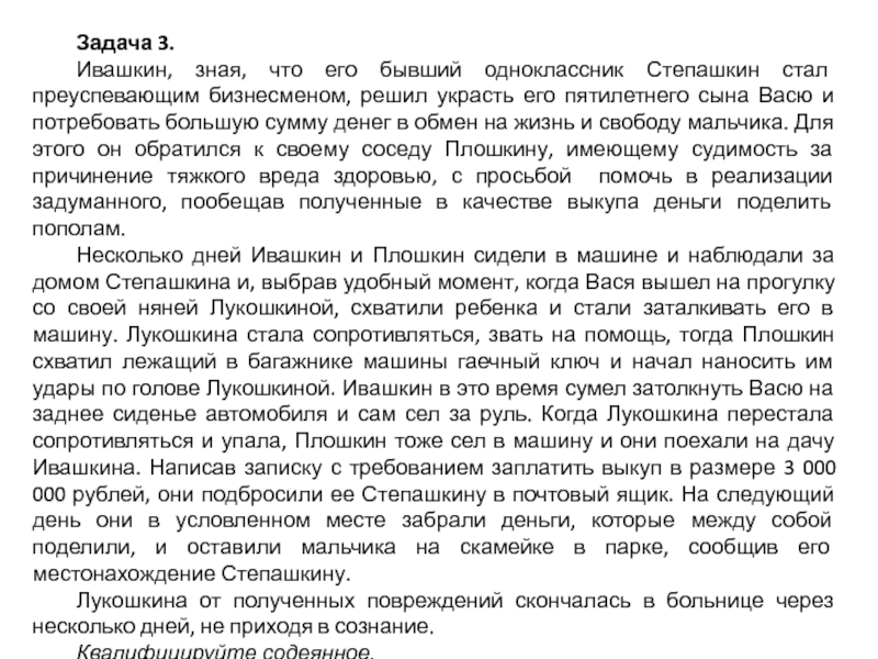 сумму денег в обмен на жизнь и свободу мальчика. Для этого он обратился к своему соседу Плошкину, имеющему судимость за причинение тяжкого вреда здоровью, с просьбой помочь в реализации задуманного, пообещав полученные в качестве выкупа деньги поделить пополам.