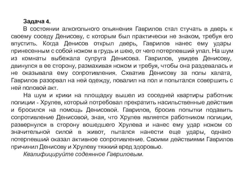 требуя его впустить. Когда Денисов открыл дверь, Гаврилов нанес ему удары принесенным с собой ножом в грудь и шею, от чего потерпевший упал. На шум из комнаты выбежала супруга Денисова. Гаврилов, увидев Денисову, двинулся в ее сторону, размахивая ножом и требуя, чтобы она раздевалась и не оказывала ему сопротивления. Схватив Денисову за полы халата, Гаврилов разорвал на ней одежду, повалил на пол и попытался совершить с ней половой акт.