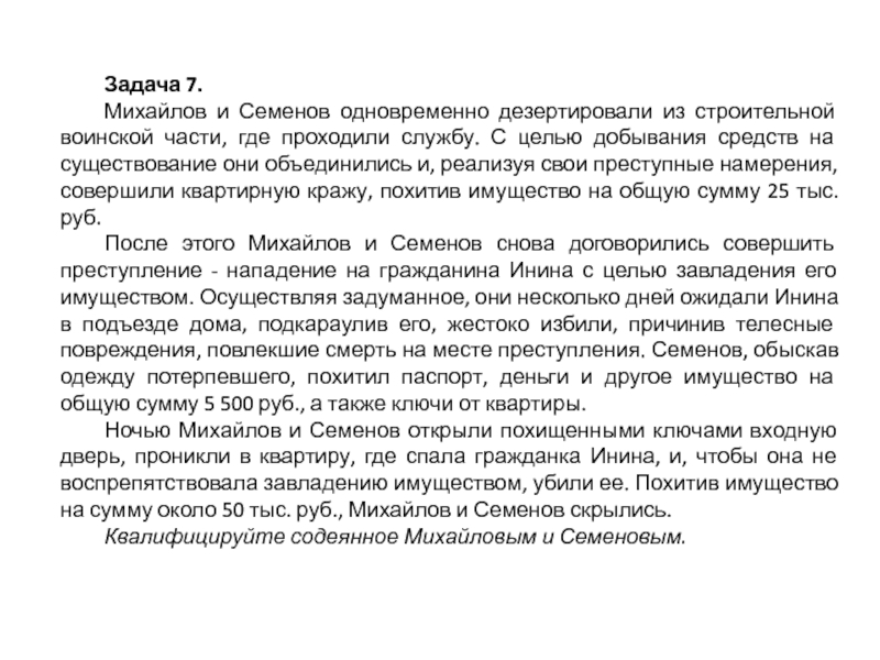 Ночью Михайлов и Семенов открыли похищенными ключами входную дверь, проникли в квартиру, где спала гражданка Инина, и, чтобы она не воспрепятствовала завладению имуществом, убили ее. Похитив имущество на сумму около 50 тыс. руб., Михайлов и Семенов скрылись.