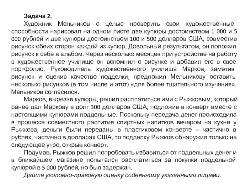 Марков, вырезав купюры, решил расплатиться ими с Рыжковым, который ранее дал Маркову в долг 300 долларов США, подложив в конверт вместе с настоящими купюрами поддельные. Поскольку передача денег происходила в процессе совместного распития спиртных напитков вечером на кухне у Рыжкова, деньги были переданы в пластиковом конверте – частично в рублях, частично в долларах США, то подделку Рыжков обнаружил только на следующее утро, открыв конверт.
