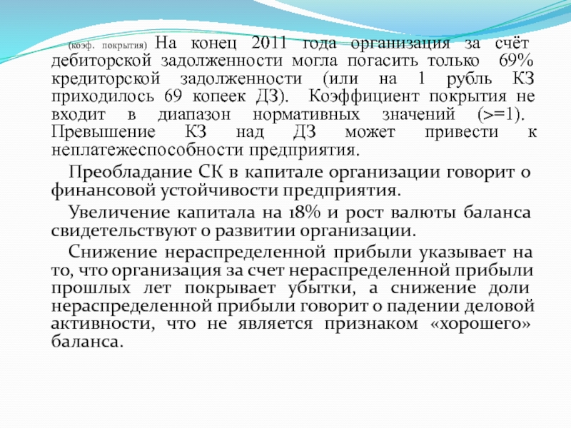 Слайд 11(коэф. покрытия) На конец 2011 года организация за счёт дебиторской
