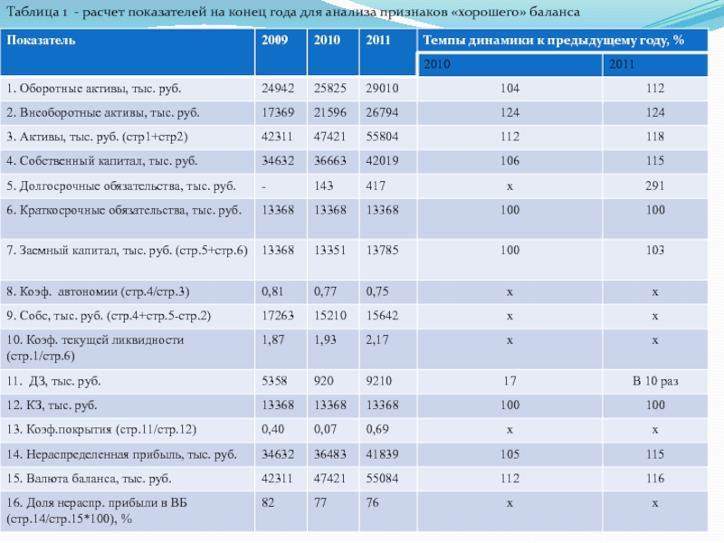 Слайд 8Таблица 1 - расчет показателей на конец года для анализа