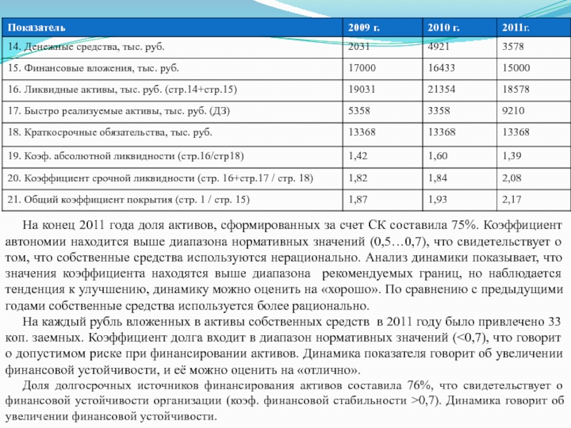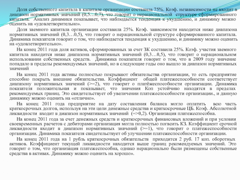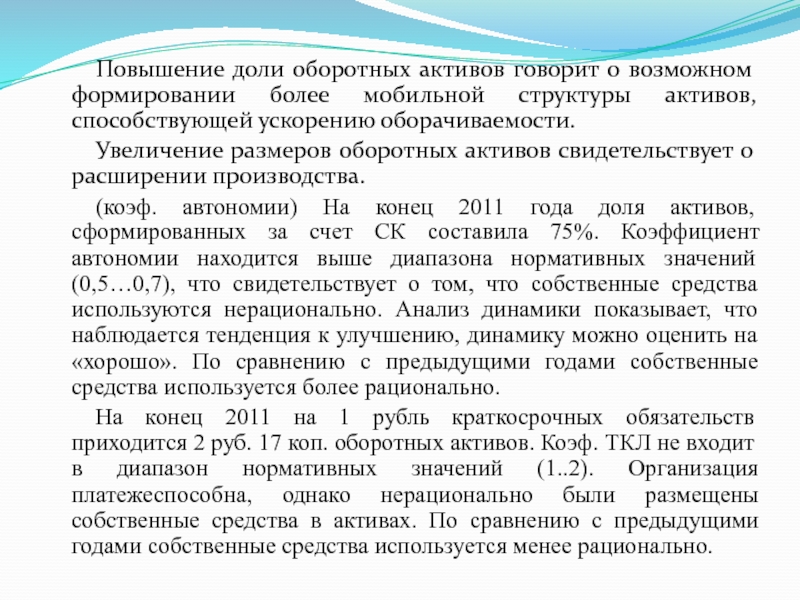 (коэф. автономии) На конец 2011 года доля активов, сформированных за счет СК составила 75%. Коэффициент автономии находится выше диапазона нормативных значений (0,5…0,7), что свидетельствует о том, что собственные средства используются нерационально. Анализ динамики показывает, что наблюдается тенденция к улучшению, динамику можно оценить на «хорошо». По сравнению с предыдущими годами собственные средства используется более рационально.