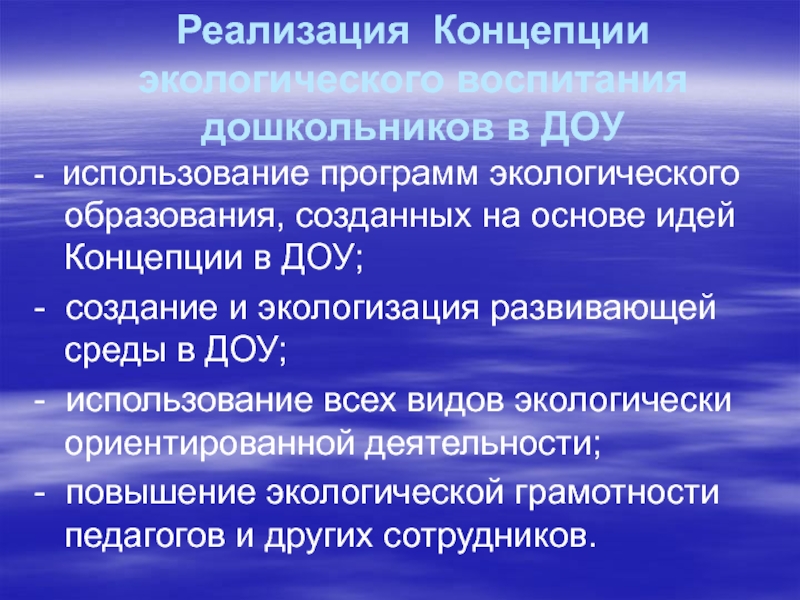 Слайд 24Реализация Концепции экологического воспитания дошкольников в ДОУ