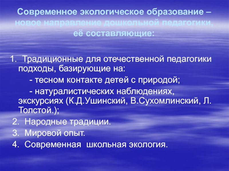 Слайд 2Современное экологическое образование – новое направление дошкольной педагогики, её составляющие: