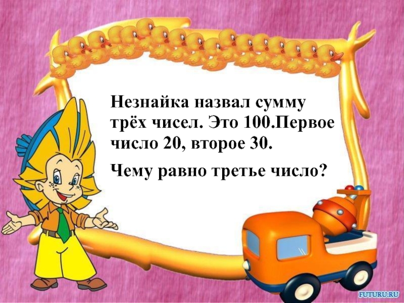 Незнайка назвал сумму трёх чисел. Это 100.Первое число