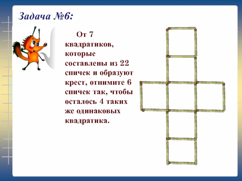 Задача №6:   От 7 квадратиков, которые составлены из 22 спичек и образуют крест, отнимите 6