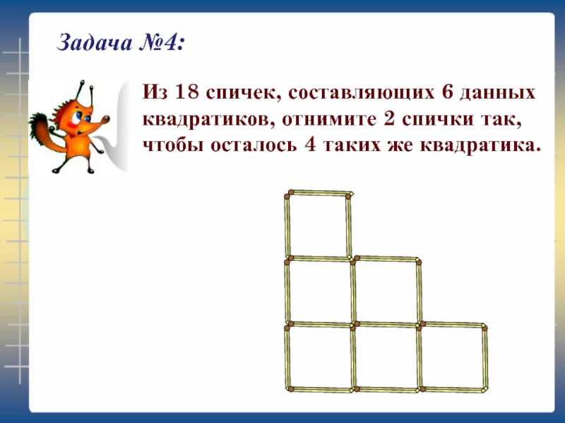 Задача №4:Из 18 спичек, составляющих 6 данных квадратиков, отнимите 2 спички так, чтобы осталось 4 таких же