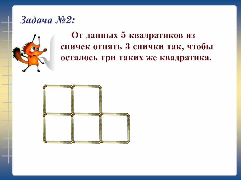 Задача №2:  От данных 5 квадратиков из спичек отнять 3 спички так, чтобы осталось три таких