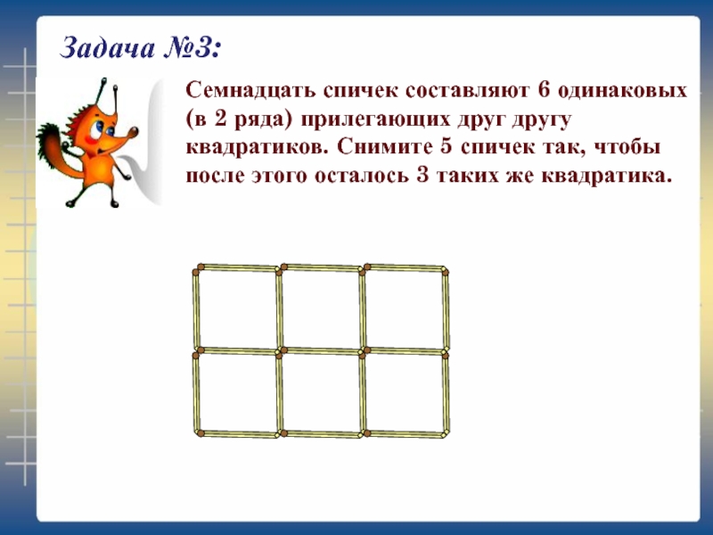 Задача №3:Семнадцать спичек составляют 6 одинаковых (в 2 ряда) прилегающих друг другу квадратиков. Снимите 5 спичек так,