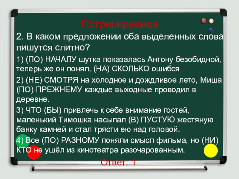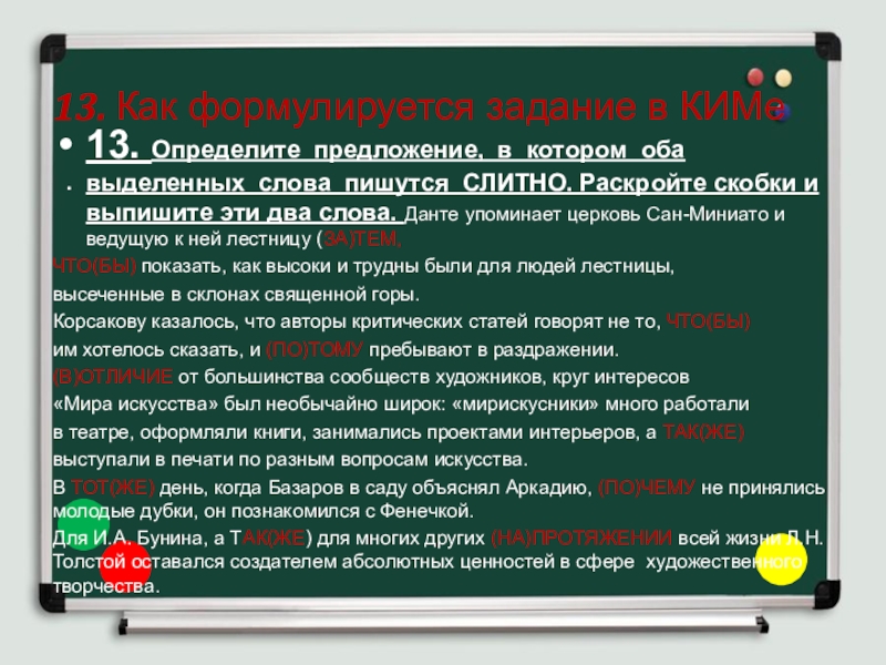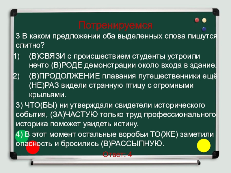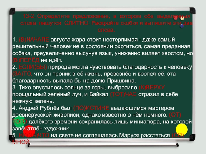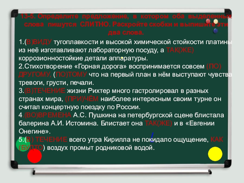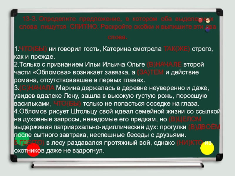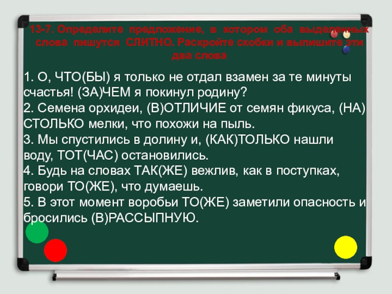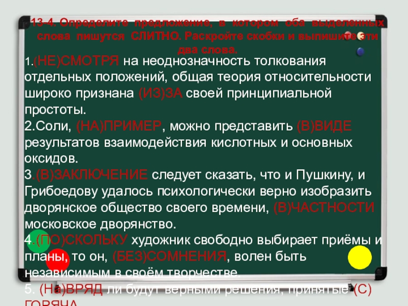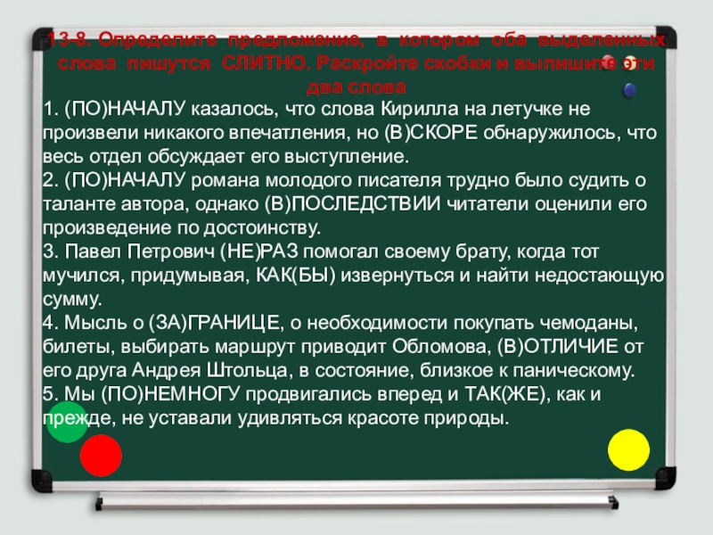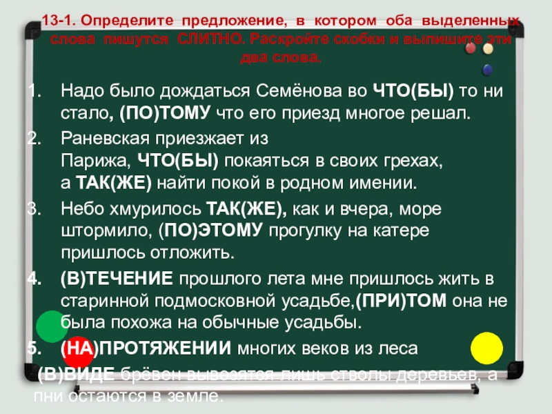 Слайд 2213-3. Определите предложение, в котором оба выделенных слова пишутся СЛИТНО.