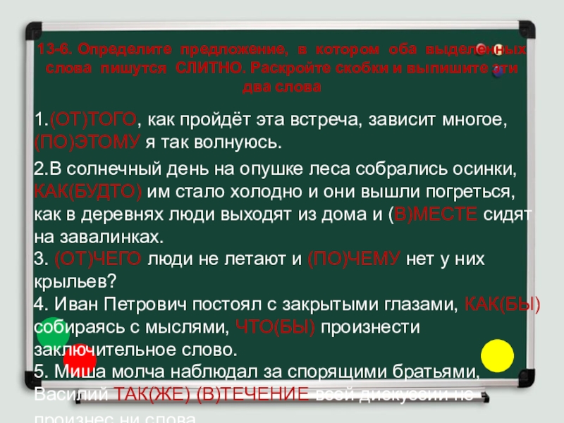 Слайд 2513-6. Определите предложение, в котором оба выделенных слова пишутся СЛИТНО.