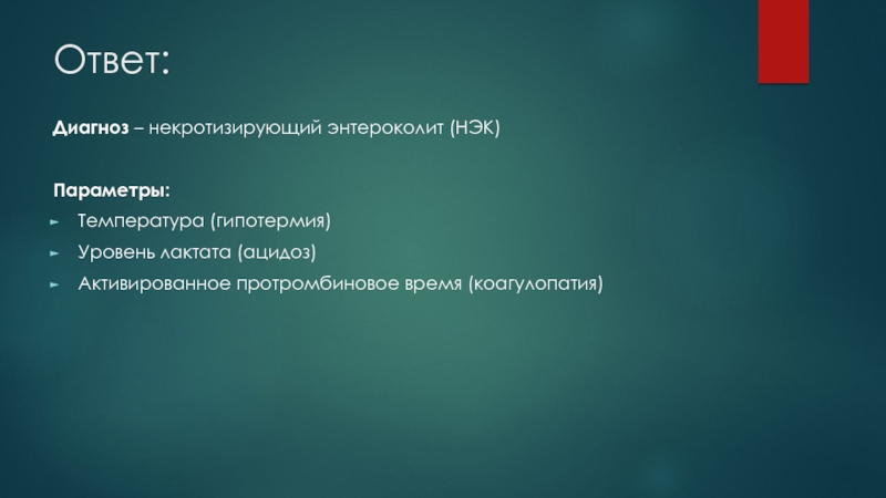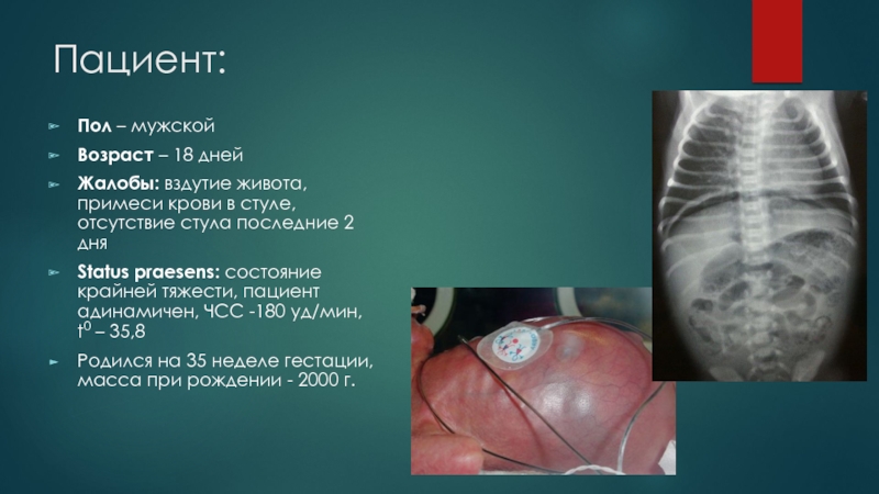 тяжести, пациент адинамичен, ЧСС -180 уд/мин, t0 – 35,8Родился на 35 неделе гестации, масса при рождении - 2000 г.
