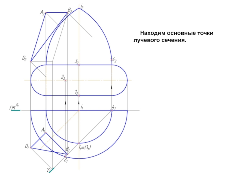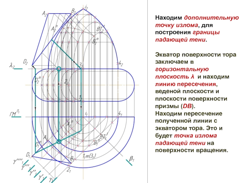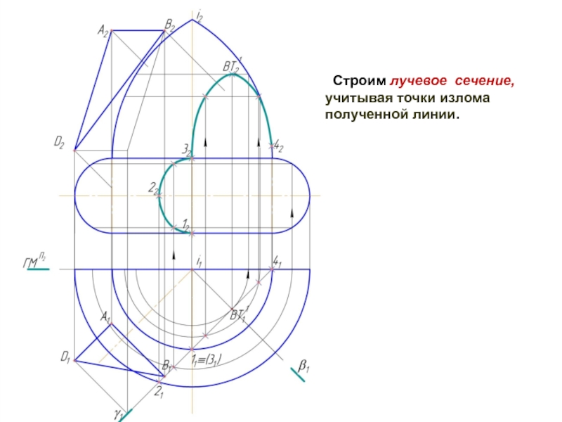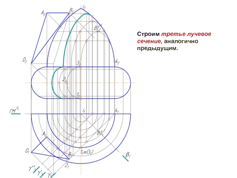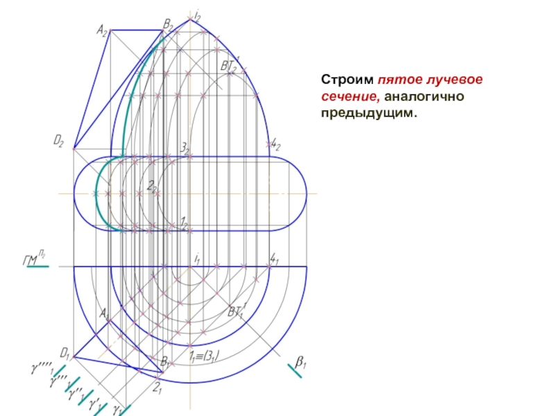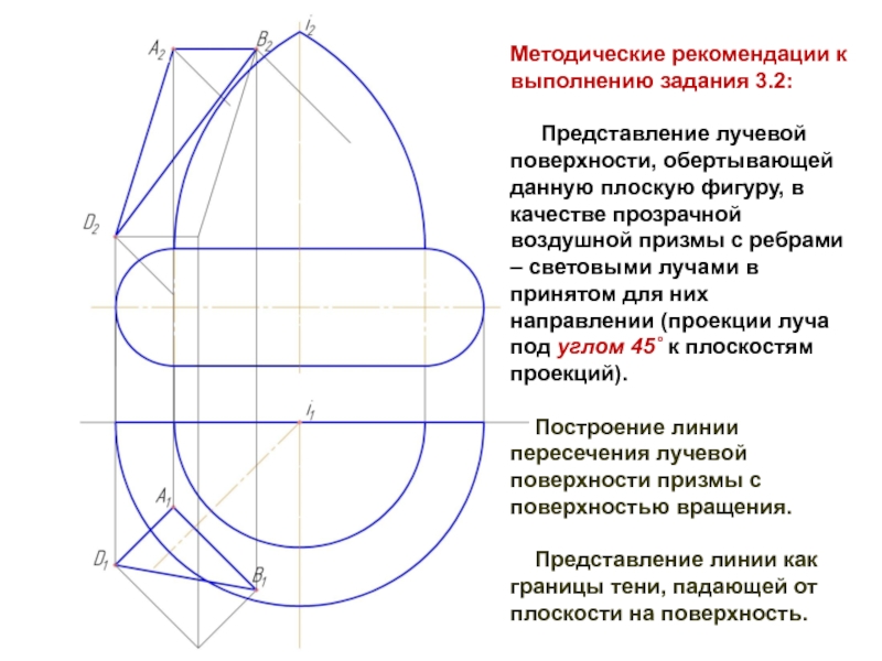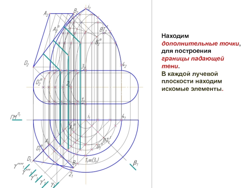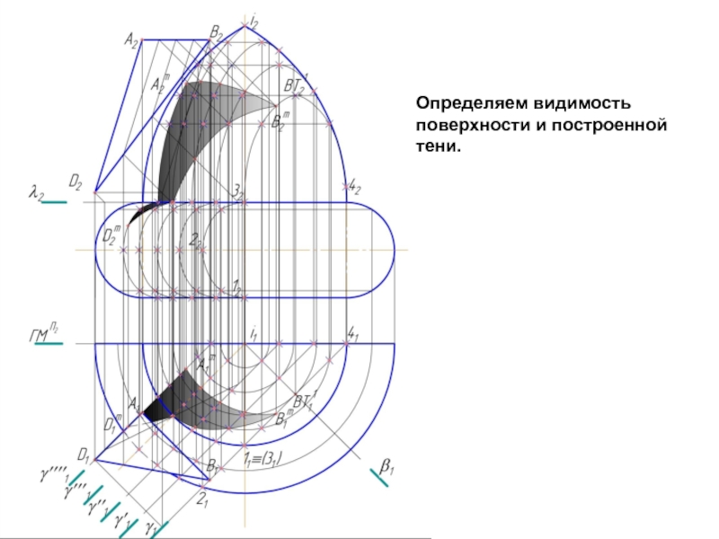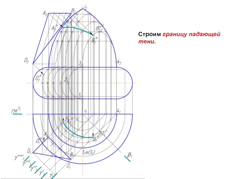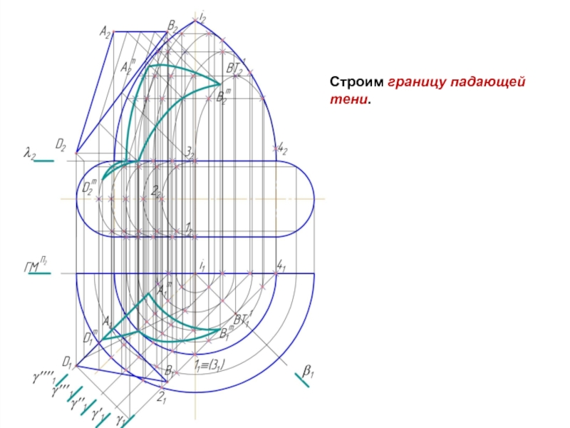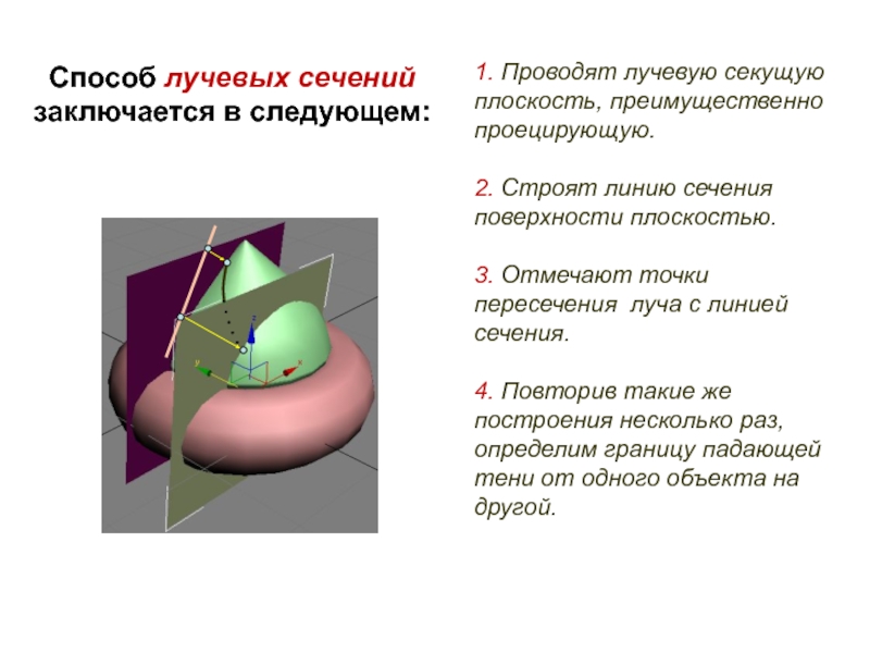 Построить тень , падающую на поверхность от фигуры (способом лучевых сечений).