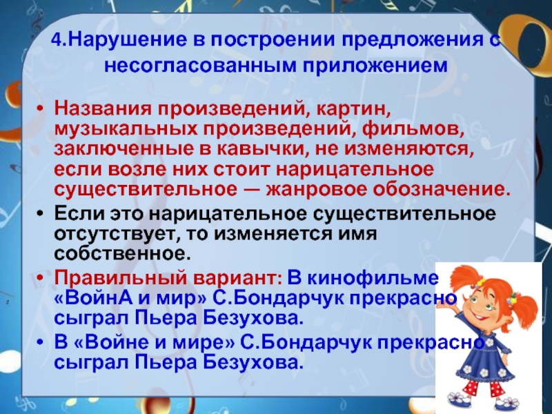 Слайд 144.Нарушение в построении предложения с несогласованным приложением
