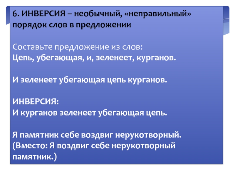 Слайд 286. ИНВЕРСИЯ – необычный, «неправильный» порядок слов в предложении