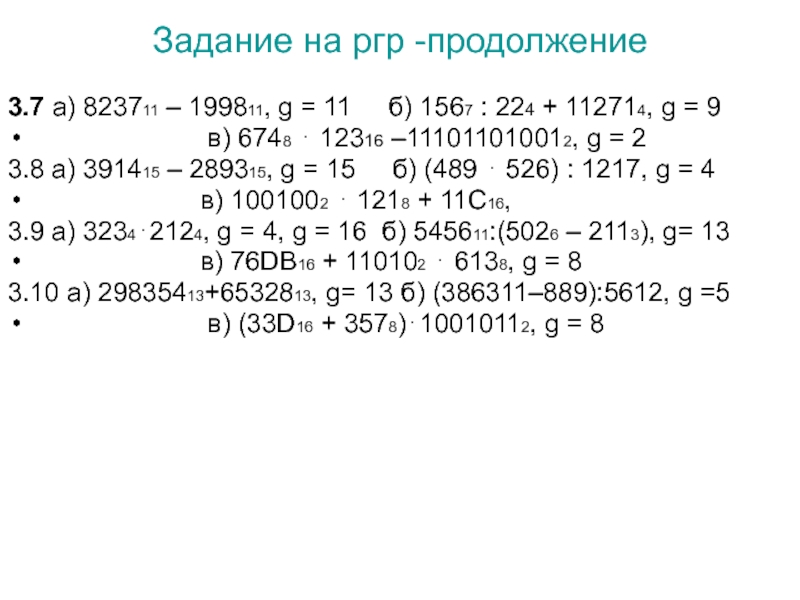 б) 536 ⋅ 859 + 145, g = 14 в) C01616 : 1000002 + 17810, g= 8