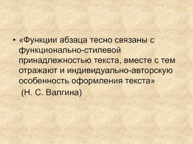 Слайд 22«Функции абзаца тесно связаны с функционально-стилевой принадлежностью текста, вместе с