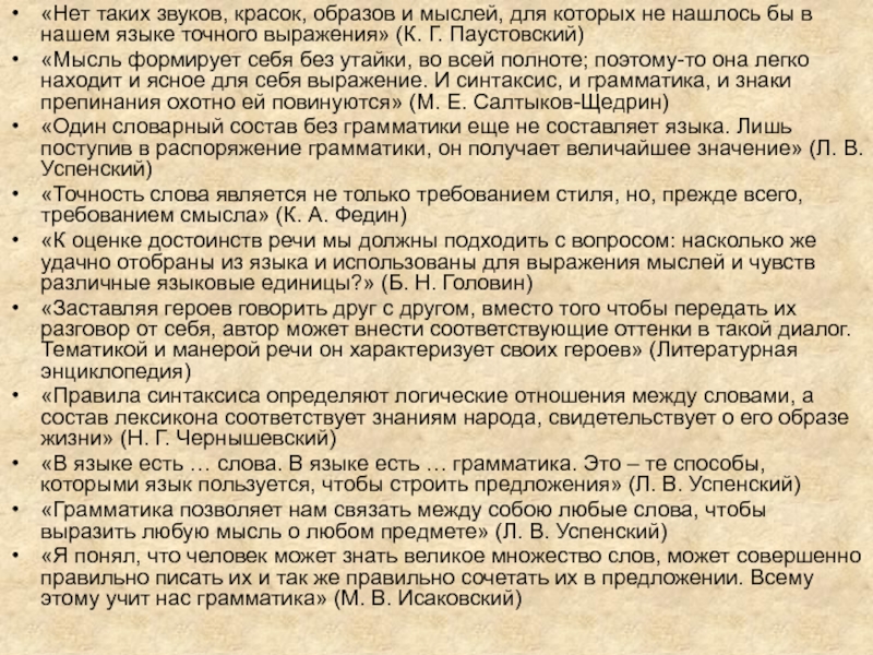 «Я понял, что человек может знать великое множество слов, может совершенно правильно писать их и так же правильно сочетать их в предложении. Всему этому учит нас грамматика» (М. В. Исаковский)