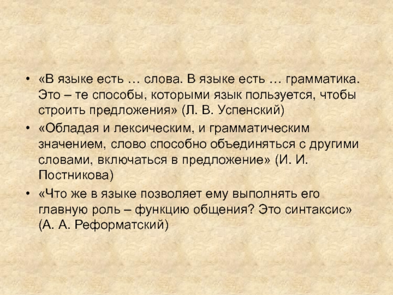 «Один словарный состав без грамматики еще не составляет языка. Лишь поступив в распоряжение грамматики, он получает величайшее значение» (Л. В. Успенский)