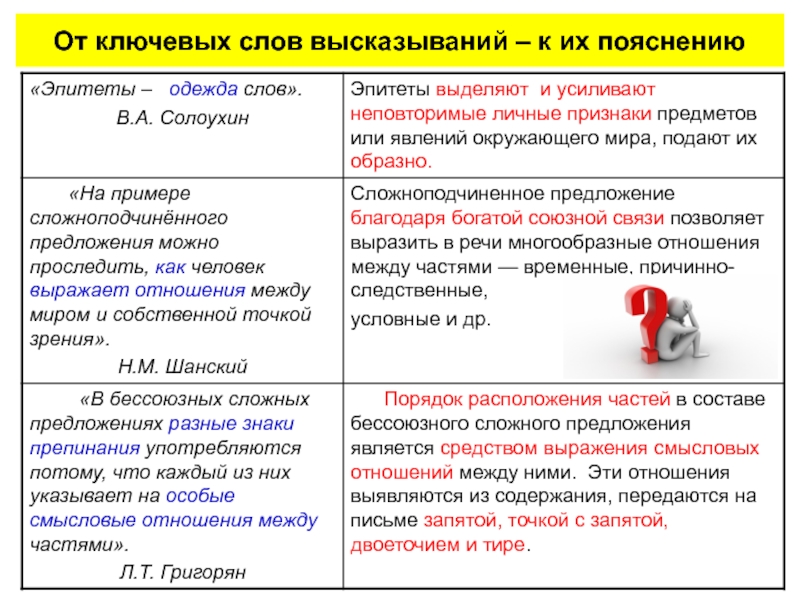 Слайд 2От ключевых слов высказываний – к их пояснению