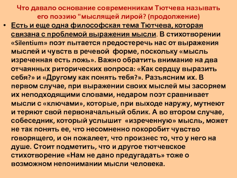 от выражения мыслей и чувств в речевой форме, поскольку «мысль изреченная есть ложь». Важно обратить внимание на два отчаянных риторических вопроса: «Как сердцу выразить себя?» и «Другому как понять тебя?». Разъясним их. В первом случае, при выражении своих мыслей мы засоряем их неподходящими словами, недаром поэт сравнивает мысли с «ключами», которые, при выходе наружу, мутнеют и теряют свой первоначальный облик. А во втором случае, собеседник, который услышит «изреченную» мысль, может не так понять ее, что несомненно покоробит чувство говорящего, и он пожалеет, что произнес то, что у него на душе. Стоит подметить, что и другое тютчевское стихотворение «Нам не дано предугадать» тоже о возможном непонимании мысли человека.