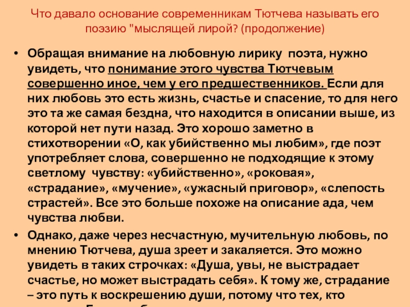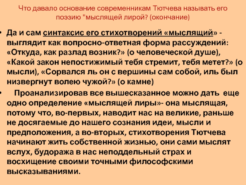 Что давало основание современникам Тютчева называть его поэзию "мыслящей лирой? (окончание)